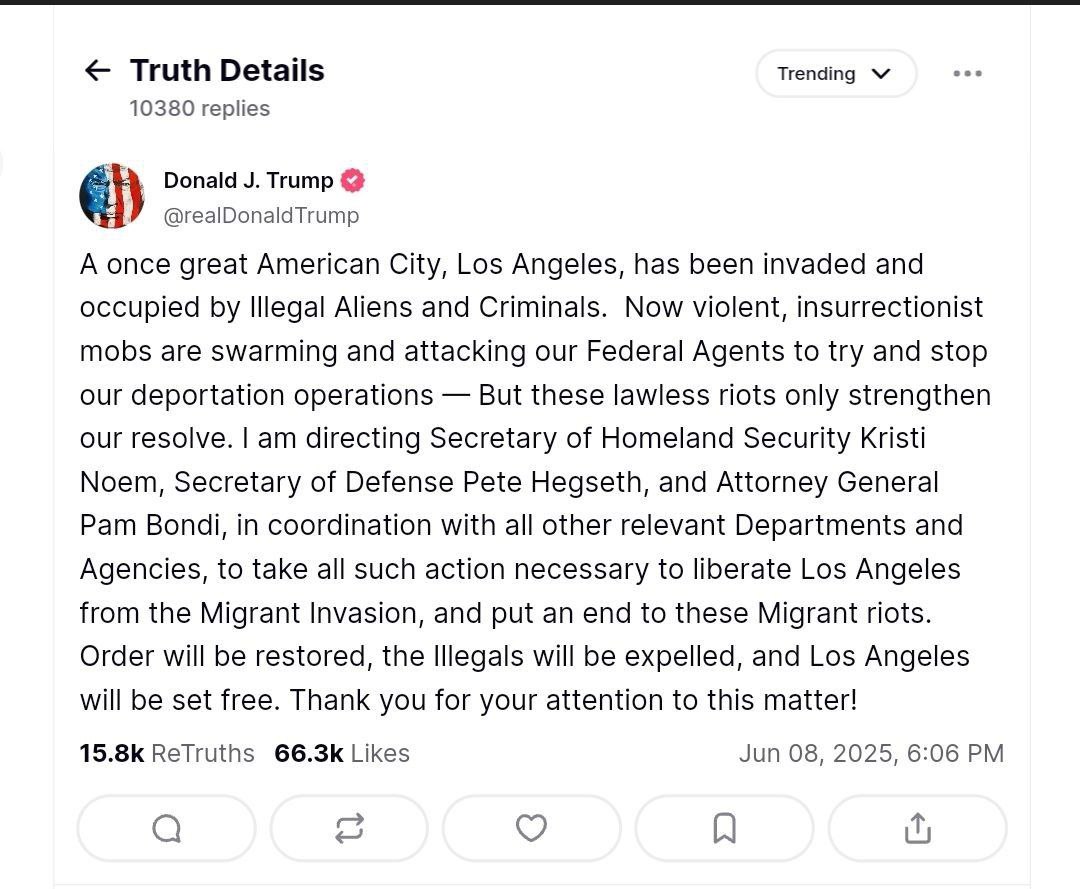 «Для меня большая честь объявить, что я установлю две прекрасные флагштоки по обеим сторонам Белого дома — на северной и южной лужайках. Это подарок от меня — того, чего всегда не хватало этому великолепному месту. Работы по рытью и установке флагштоков начнутся завтра в 7:30 утра по восточному времени. Флаги будут подняты примерно в 11:00. Это самые великолепные флагштоки — высокие, сужающиеся к верху, нержавеющие, с верёвкой внутри и высочайшего качества. Надеюсь, они будут с гордостью стоять по обе стороны Белого дома ещё долгие годы!», — Трамп