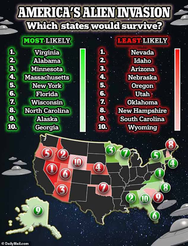 По данным исследования Daily Mail, при вторжении инопланетян безопаснее всего будет в штате Вирджиния, так как там «самое высокое военное присутствие на душу населения в стране».