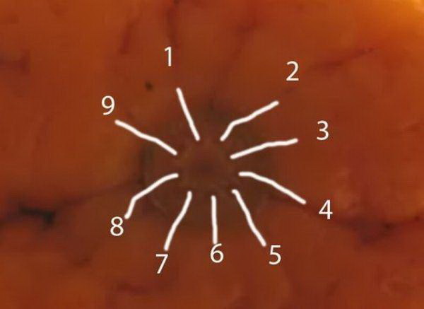 Под ней, мы видим малюсенькие дырочки. Считаем сколько их. Когда посчитали, то мы уже знаем, сколько долек в апельсине.