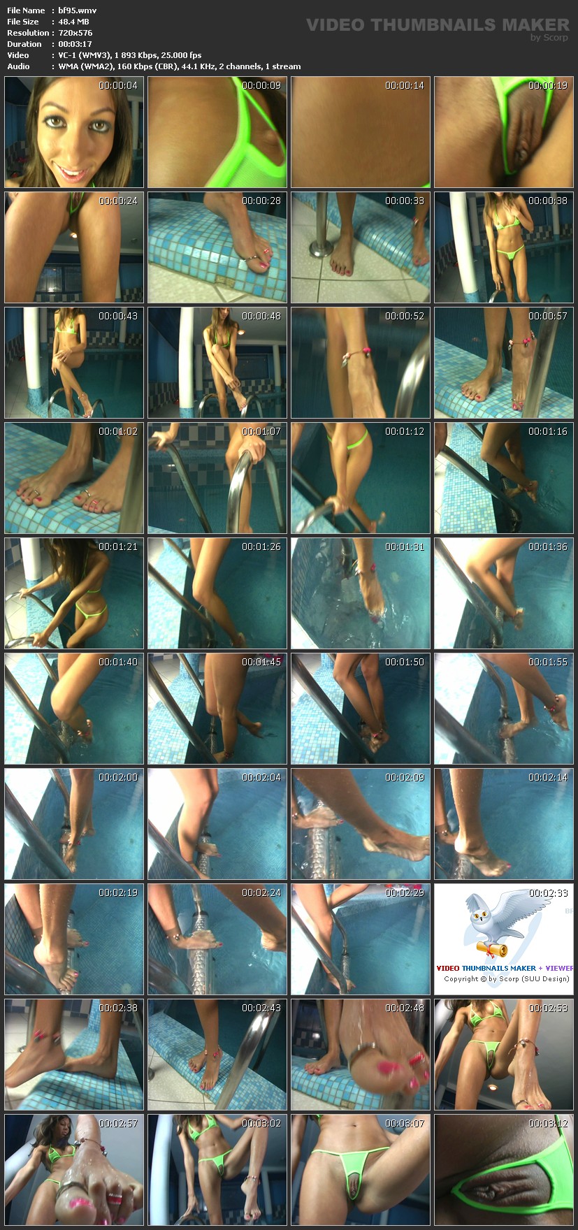 Описание:Here in this clip our newest brunette sweetie has a very special bikini on her hot body. This leaves out the most important parts, so that the nipples and the pussy lips are not covered. And her feet are also super sexy with the many toe rings and anklets. Especially when she was dipping her feet into the pool and they got wet, they look so hot. Информация о ролике:Разрешение: 720х576 Продолжительность: 0:03:17 Размер: 48,3 Mb Скачать / Download Вам необходимо ЗАРЕГИСТРИРОВАТЬСЯ НА ФОРУМЕ, чтобы скачать файл.