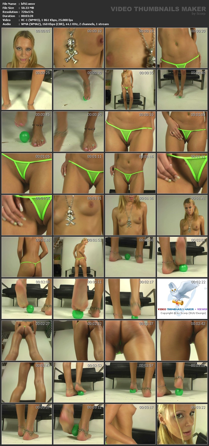 Описание:The leggy blonde girl in only dressed in a green fishnet bikini panty and a skull chain hanging between her super sweet tits. She is barefoot and is playing with a green massage ball and you can watch her pedicured toes and her soles. Информация о ролике:Разрешение: 720х576 Продолжительность: 0:03:28 Размер: 50,3 Mb Скачать / Download Вам необходимо ЗАРЕГИСТРИРОВАТЬСЯ НА ФОРУМЕ, чтобы скачать файл.