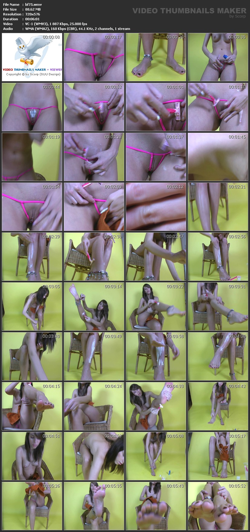 Описание:The tall brunette girl has one of our favourite bikinis on her sexy body. It is only a pink bikini panty, that is completely open, so that you can see her pussy lips. And she has a very small stripe of hair over her pussy lips, that she want to shave. When she is finished with that, there is no hair anymore and her pussy is completely bald. After that, she is also shaving her legs and we made some very nice shots of her long legs and soles. Информация о ролике:Разрешение: 720х576 Продолжительность: 0:06:01 Размер: 88,6 Mb Скачать / Download Вам необходимо ЗАРЕГИСТРИРОВАТЬСЯ НА ФОРУМЕ, чтобы скачать файл.