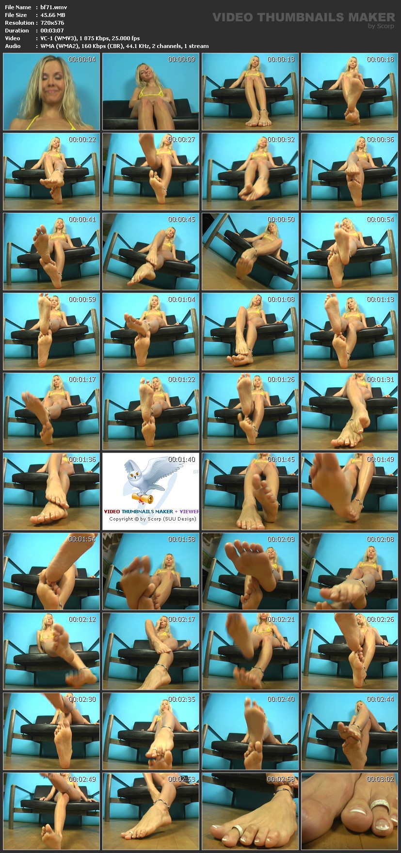 Описание:The girl with the long, black hair is walking towards our camera like she was on a runway. She has a yellow naked string bikini on and when she is close to us, we film her amazing toes in the yellow flip-flops. Then she is walking back and you can see her nice ass. Later she is doing the same but this time with nothing but some blue wooden sandals on her sexy feet. Информация о ролике:Разрешение: 720х576 Продолжительность: 0:02:26 Размер: 35,1 Mb Скачать / Download Вам необходимо ЗАРЕГИСТРИРОВАТЬСЯ НА ФОРУМЕ, чтобы скачать файл.