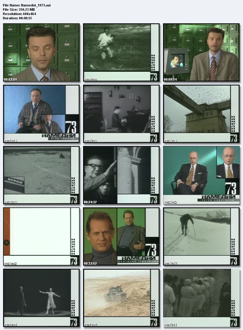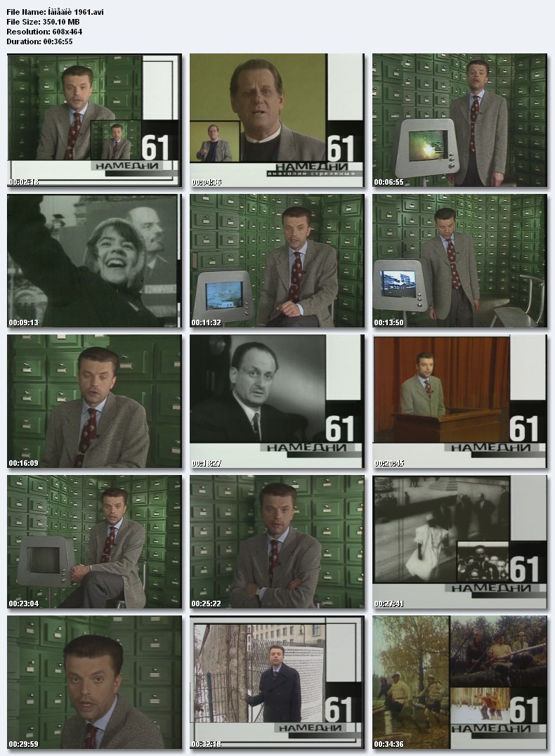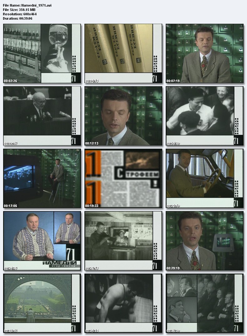 Название: Намедни 1961-1991. Наша эра. Жанр: Документальный / Исторический / Сериал / Наше кино Страна: Россия Телекомпания НТВ Режиссер: Джаник Файзиев Ведущий : Леонид Парфенов Год: 1998 Описание:"Намедни 1961-1991" - энциклопедия советской жизни в изложении ведущего Леонида Парфенова. События, люди, явления, определившие образ жизни. То, без чего нас невозможно представить, еще труднее - понять. 30 видеофильмов год за годом описывает события, людей и явления, сформировавшие наш образ жизни в самый зрелый и мирный период истории СССР . В каждой серии - редкая, часто уникальная, кинохроника, рассекреченные детали знаменитых политических событий, отрывки из лучших кинокартин и мультфильмов, подробности моды, анекдоты, поговорки и комментарии «экспертов» - Анатолия Стреляного, Егора Гайдара, Сергея Караганова, Ренаты Литвиновой и Татьяны Друбич. Качество: TVRip Звуковые дорожки: Русский Dolby Digital 2.0 Формат изображения: Standart 4:3 (1,33:1). Размер: 30 серий примерно по 350. Mb Намедни-1961.Полет Гагарина, новые деньги, обувь на каблуках-шпильках, кукуруза - «королева полей», артистка оперетты Татьяна Шмыга, рекорды Валерия Брумеля, клоун Олег Попов, Берлинский кризис, Вицин-Никулин-Моргунов, дело Рокотова, первый ток Братской ГЭС, песня «Хотят ли русские войны?», фильм «Человек-амфибия». Размер 350.1 Mb  Вам необходимо ЗАРЕГИСТРИРОВАТЬСЯ НА ФОРУМЕ, чтобы скачать файл.
