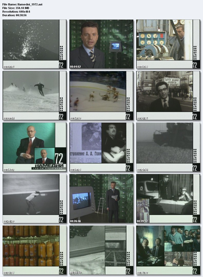 Намедни-1972.Самотлор - главная нефтебаза страны, балет - Павлова и Годунов, Никсон в Москве, хоккей СССР - НХЛ, Александр Галич, теракт на олимпиаде в Мюнхене, анекдоты про чукчу, дефицит колбасы, телепрограмма «От всей души», Фишер - чемпион мира по шахматам. Размер 350.18 Mb Вам необходимо ЗАРЕГИСТРИРОВАТЬСЯ НА ФОРУМЕ, чтобы скачать файл.