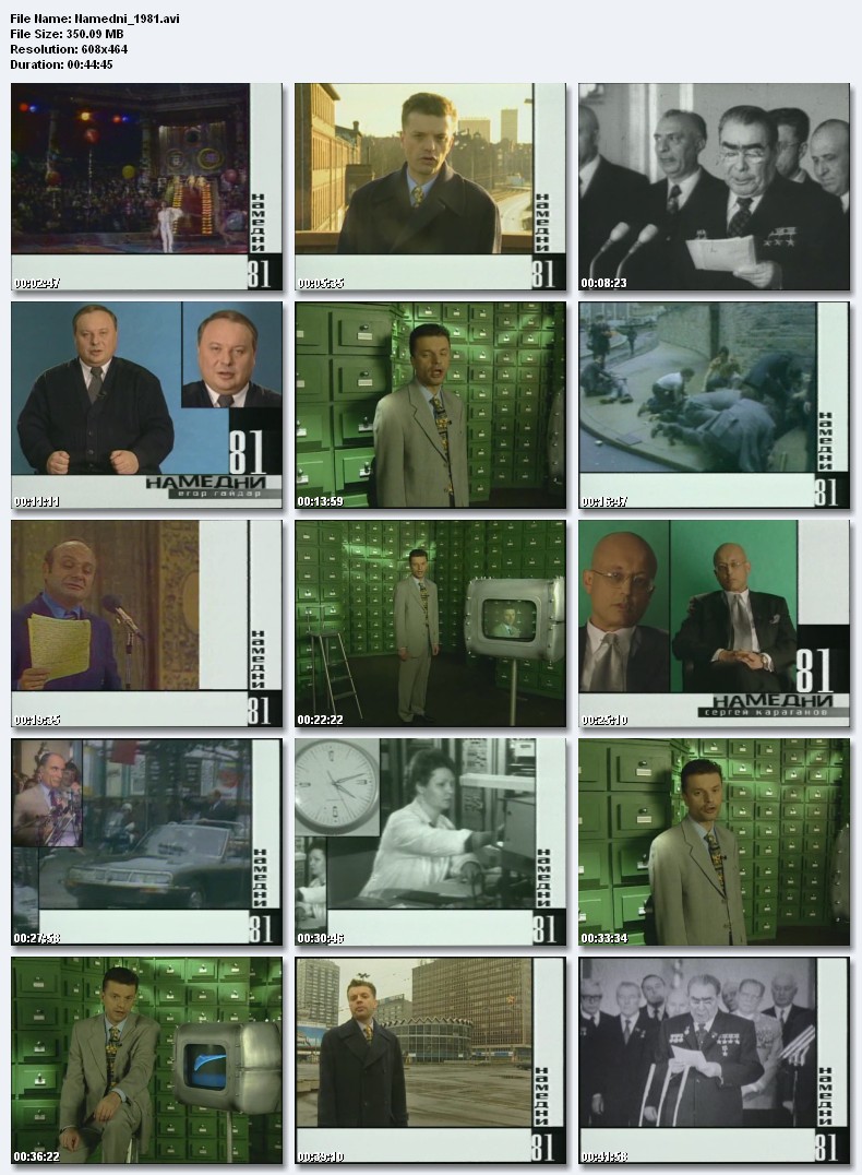 Намедни-1981.Военное положение в Польше, аэробус «ИЛ-86», дело фирмы «Океан», голодовка в Бэлфасте, повышение цен на бензин и водку, покушения на Рейгана, Садата, Папу Римского; «Динамо» (Тбилиси) - обладатель Кубка кубков, Бельмондо, «Юнона и Авось» в Ленкоме, 75 лет Брежневу, переход на летнее время, Миттеран - президент Франции, Михаил Жванецкий, электрический самовар. Размер 350.09 Mb  Вам необходимо ЗАРЕГИСТРИРОВАТЬСЯ НА ФОРУМЕ, чтобы скачать файл.