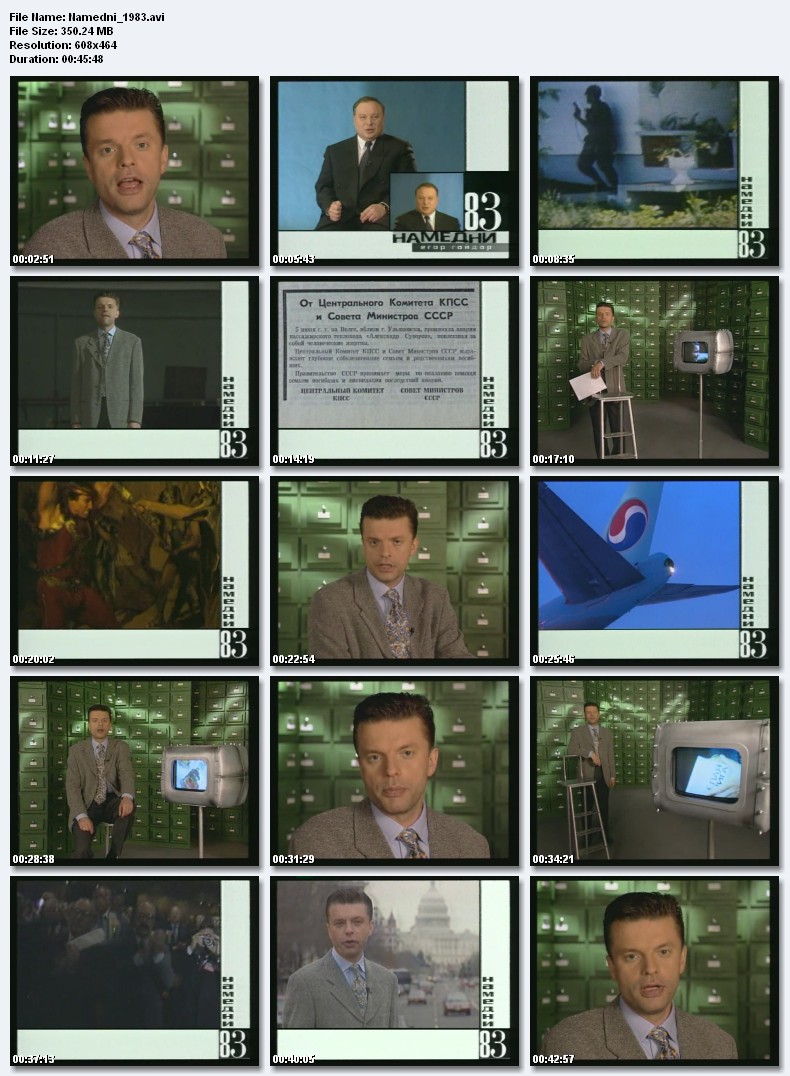Намедни-1983.Янковский и Неелова - образы современников, универмаг «Москва», водка «Андроповка», минтай - главная рыба, борьба за дисциплины, конфронтация с США, «Империя зла», антисионистский комитет советской общественности, Саманта Смит, сбили корейский «Боинг», Юрий Антонов, группа «Земляне», авария теплохода «Александр Суворов», ленинградский рок-клуб, пластилиновые мультфильмы Александра Татарского, Зураб Церетели. Размер 350.24 Mb  Вам необходимо ЗАРЕГИСТРИРОВАТЬСЯ НА ФОРУМЕ, чтобы скачать файл.