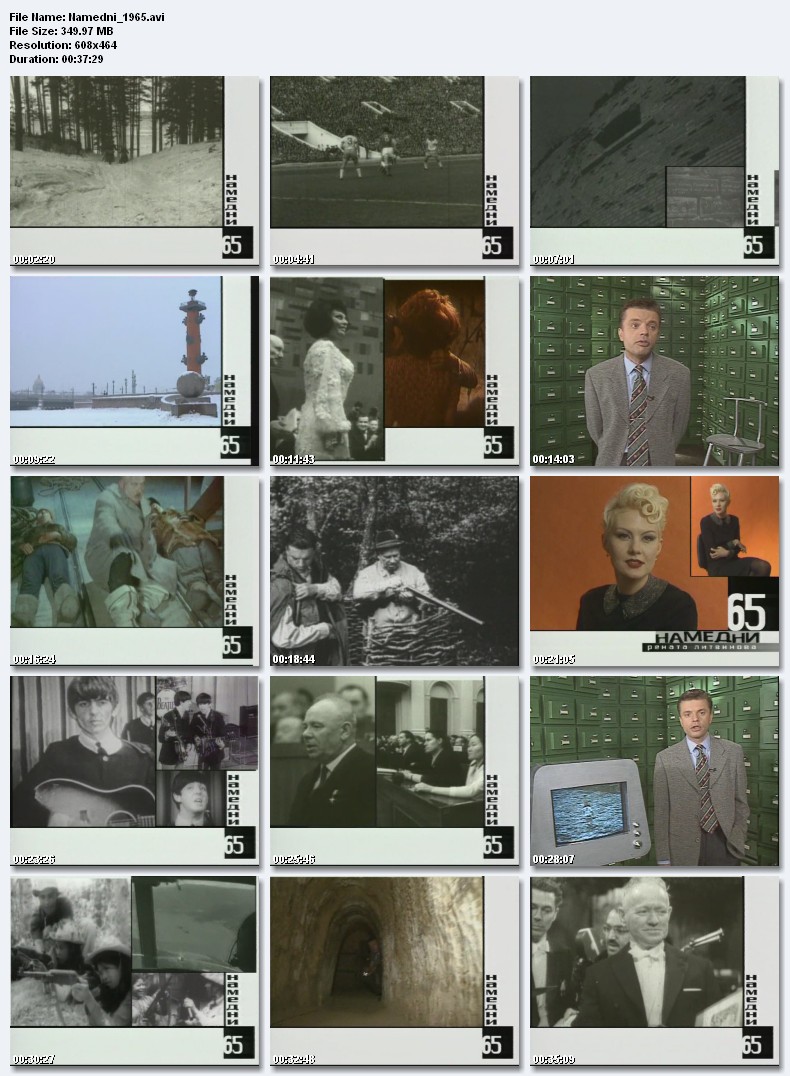 Намедни-1965.XX лет Победы, Пеле в Лужниках, кастрюля-скороварка, день учителя, война во Вьетнаме, битломания, Нобелевская премия - Сергею Шолохова, радиоприемник «Спидола», индо-пакистанский инцидент, Алексей Леонов - первый человек в открытом космосе, футболист Эдуард Стрельцов Размер 349.97 Mb Вам необходимо ЗАРЕГИСТРИРОВАТЬСЯ НА ФОРУМЕ, чтобы скачать файл.