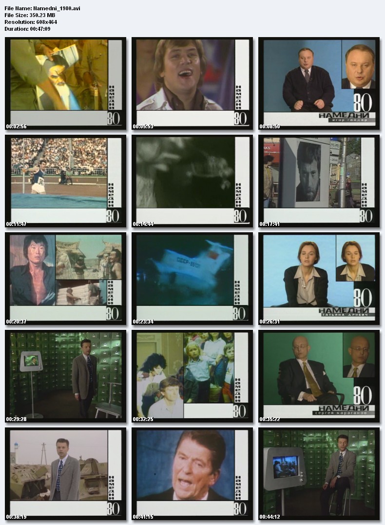 Намедни-1980.Смерть Высоцкого, аэропорт Шереметьево-2, высылка Сахарова в Горький, эстонская эстрада, мода на дубленки, фестиваль «Тбилиси-80», группа «Машина времени», олимпиада в Москве, Рейган - президент, Джуна Давиташвили, убийство Джона Леннона, широкомасштабные военные действия в Афганистане, институт микрохирургии глаза - Святослав Федоров. Размер 350.23 Mb  Вам необходимо ЗАРЕГИСТРИРОВАТЬСЯ НА ФОРУМЕ, чтобы скачать файл.
