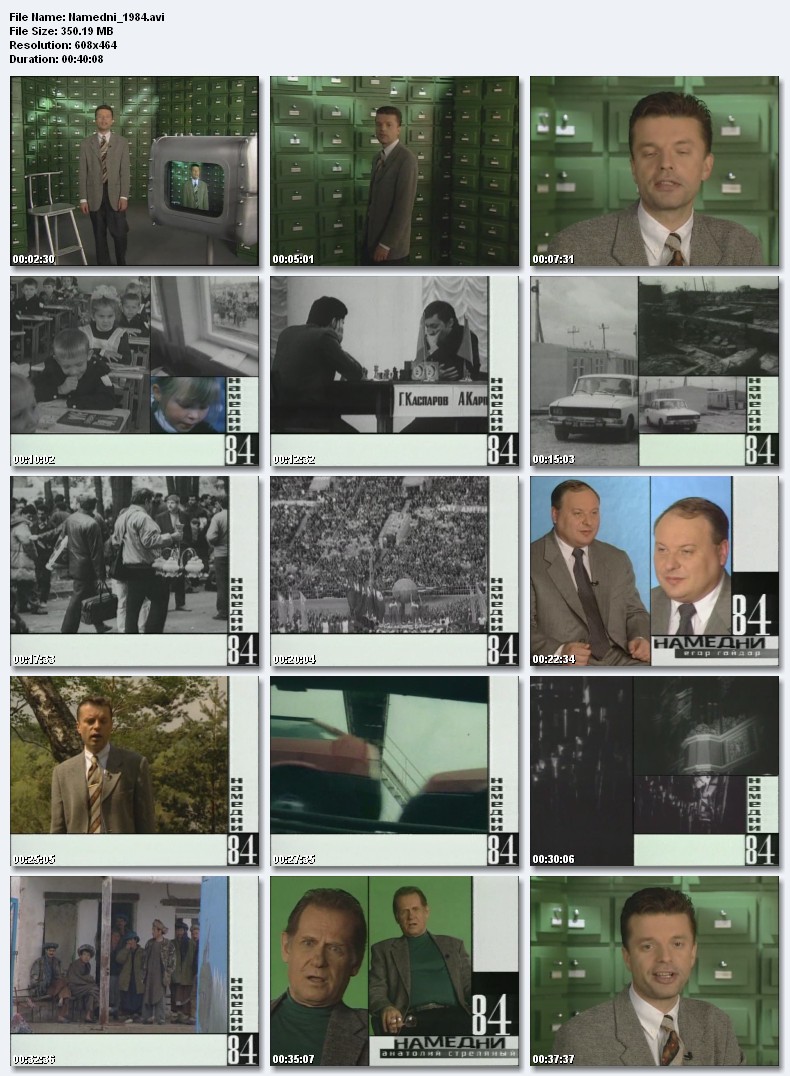 Намедни-1984.Бойкот Олимпиады в Лос-Анджелесе, Вячеслав Полунин и «Лицедеи», год наибольших потерь в Афганистане, школьная реформа, Женя Кисин, спортивный стиль в одежде, Мишель Платини, «ВАЗ-2108», Молотов восстановлен в партии, снижение цен на сельдь иваси, мода на брейк-дэнс, видеомагнитофон «ВМ-12», план поворота северных рек, смерть Андропова, смерч в Ивановской области, забастовка английских шахтеров, фильм «Любовь и голуби», убийство Индиры Ганди. Размер 350.19 Mb  Вам необходимо ЗАРЕГИСТРИРОВАТЬСЯ НА ФОРУМЕ, чтобы скачать файл.