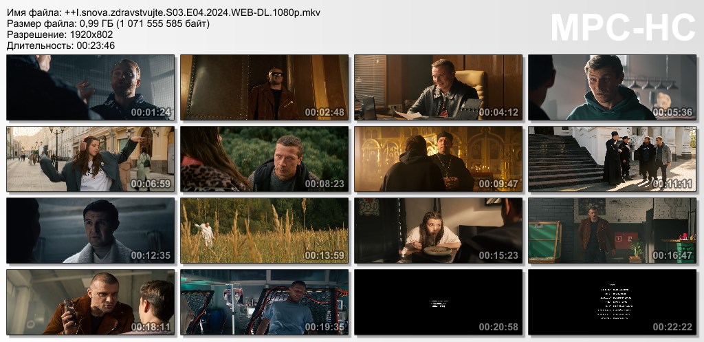 И снова здравствуйте! 3 СЕЗОН (2024) WEB-DL 1080p10 СЕРИЙ Информация о фильме: Оригинальное название фильма:И снова здравствуйте! 3 СЕЗОН Год выпуска:2024 Жанр:Комедия, криминал Режиссер:Егор Чичканов В ролях:Андрей Мерзликин, Денис Власенко, Павел Чинарёв, Любовь Толкалина, Николай Наумов, Полина Гухман, Влад Фельдман, Антон Лунин, Сергей Годин, Татьяна Струженкова, Кирилл Жандаров, Дмитрий Журавлёв (IV), Михаил Полицеймако, Сергей Епишев, Игорь Грабузов, Никита Дювбанов, Евгений Сангаджиев О фильме: В предстоящем сезоне Борис начнет новую жизнь со своей семьей, поменяет имя и откроет долгожданную кондитерскую, но вот только счастья она ему не принесет. Герой ностальгирует о былых опасных временах, тем более, что бандитское прошлое, кажется, тоже не может его отпустить. Новый бизнес, как бельмо на глазу Гоши и его хладнокровной и жестокой матери, которая вернулась в страну налаживать дела. Теперь двум злейшим врагам Коле и Борису, придется объединиться, чтобы победить Гошу и его маму. Выпущено:Россия / Кинопоиск, Медиаслово Продолжительность серии: ~ 00:25:00 Озвучивание:Оригинальное [БЕЗ РЕКЛАМЫ!]Качество:WEB-DL 1080p Формат:MKV (x264) Видео:MPEG-4 AVC, ~ 5120 Кбит/с, 1920x804, 25 кадр/с Аудио №1:Русский, АC3, 6 ch, 448 Кбит/с RUS Аудио №2:Русский, E-AC3, 6 ch, 448 Кбит/с Субтитры:Русские (full, SDH) Размер серии:~ 1,2Гб СКАЧАТЬ 1 СЕРИЯ: Вам необходимо ЗАРЕГИСТРИРОВАТЬСЯ НА ФОРУМЕ, чтобы скачать файл.