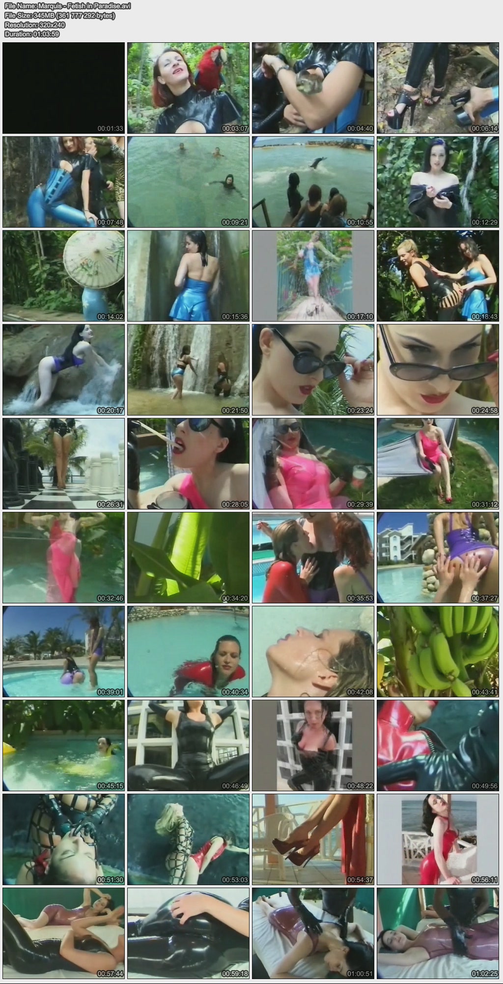 Название: Fetish in Paradise / Фетиш в Раю Год выпуска: 2003 Продолжительность: 01:03:59 В ролях: Bianca, Dita Von Teese, Tess Описание: Snorkeling, diving tropical reefs, sailing catamarans, swimming with dolphins, hugging snakes and parrots, pool fun and water slides - and all in latex? No problem, mon - it's all possible at the annual "Kink" event on Jamaica! For a whole week, pervs go crazy in a luxury resort. That's fetish fun all inclusive style! Качество: VHSRip Формат: AVI Видео: Xvid 320x240 31.00fps 426kbps Аудио: MPEG Audio Layer 3 44100Hz stereo 320kbps Размер: 345 mb Скачать:  Вам необходимо ЗАРЕГИСТРИРОВАТЬСЯ НА ФОРУМЕ, чтобы скачать файл.