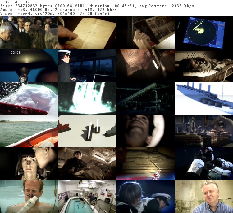 О фильме: Хотите знать правду о Титанике? Уникальный эксперимент над одной из историй о легенде. С помощью новейшей аппаратуры и архивных записей ученые выясняют, соответствовала ли действительности киноверсия режиссера Джеймса Кэмерона роковому столкновению корабля с айсбергом. Проверке подвергнуто все: персонажи фильма, их имена, социальное положение, расстояние от корабля до айсберга, действия капитана и команды и даже состав айсбергов. Испытание пройдет и человеческая выносливость. С помощью добровольца под наблюдением тепловизионной камеры исследуются функции организма в экстремальных условиях.