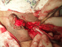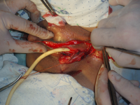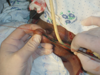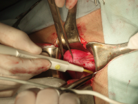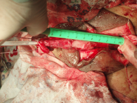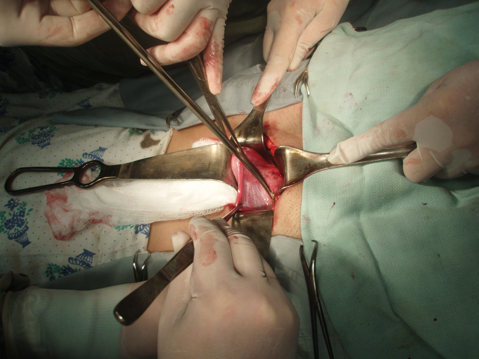 1. После обработки операционного поля под эндотрахеальным наркозом сделан кожный разрез по Пфаненштилю, гемостаз. Апоневроз рассечен . Мышцы разведены. Брюшина вскрыта. (Видео 01 - файл mp4, 1,46 mb, 00-00-16)