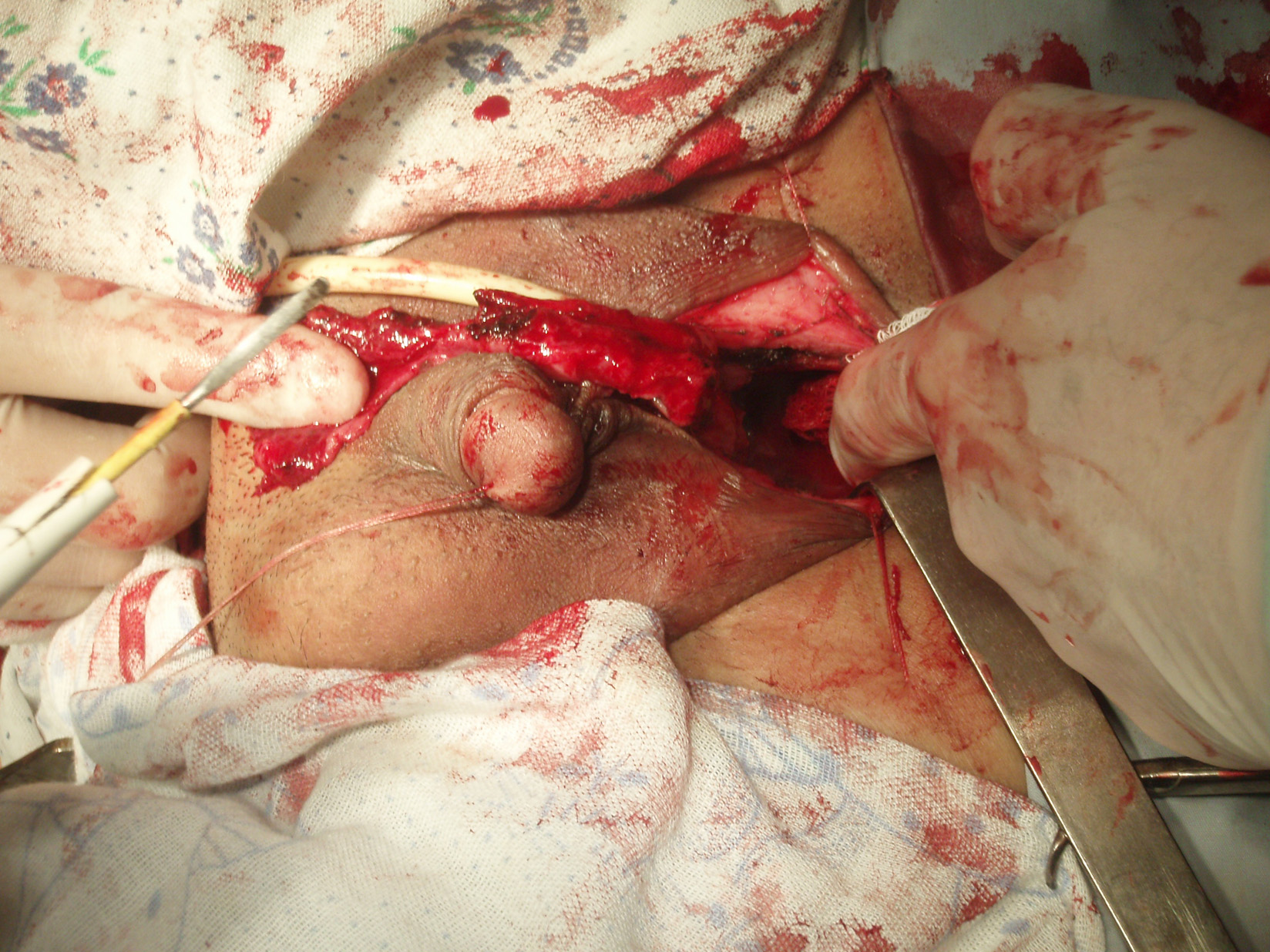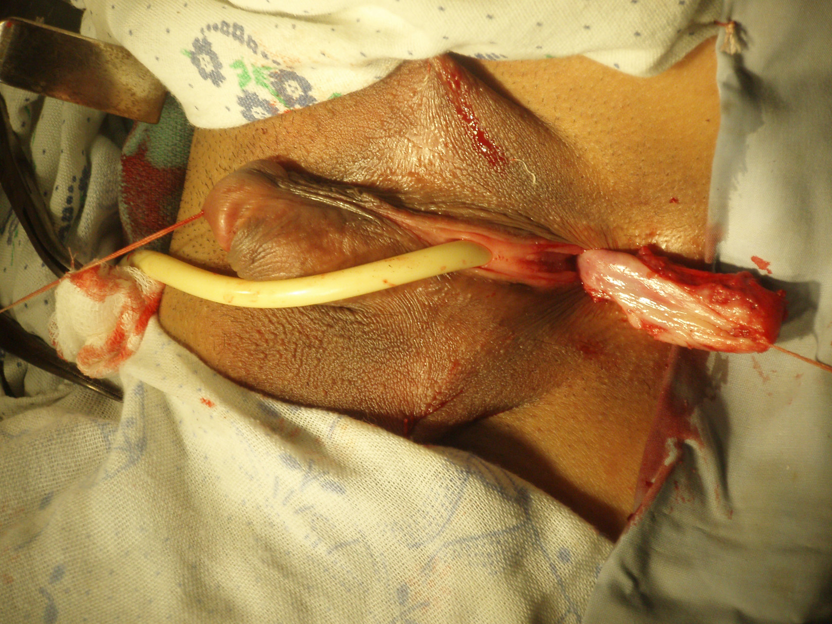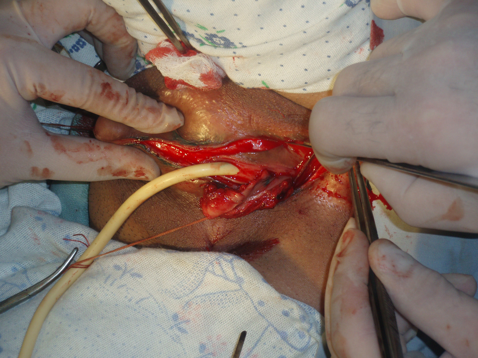 По настоянию пациента ему была произведена одноэтапная операция: экстирпация матки с придатками, удаление влагалища, уретропластика из передней стенки влагалища на сосудистой ножке, выпрямление полового члена с иссечением хорды и выпрямлением полового члена, низведение правого яичка с иссечением оболочек по Бергману , дренирование брюшной полости через промежность, эпицистостомия.