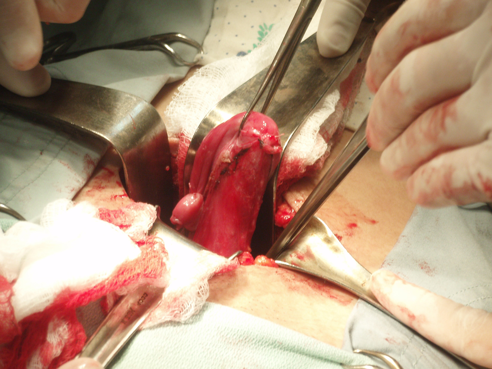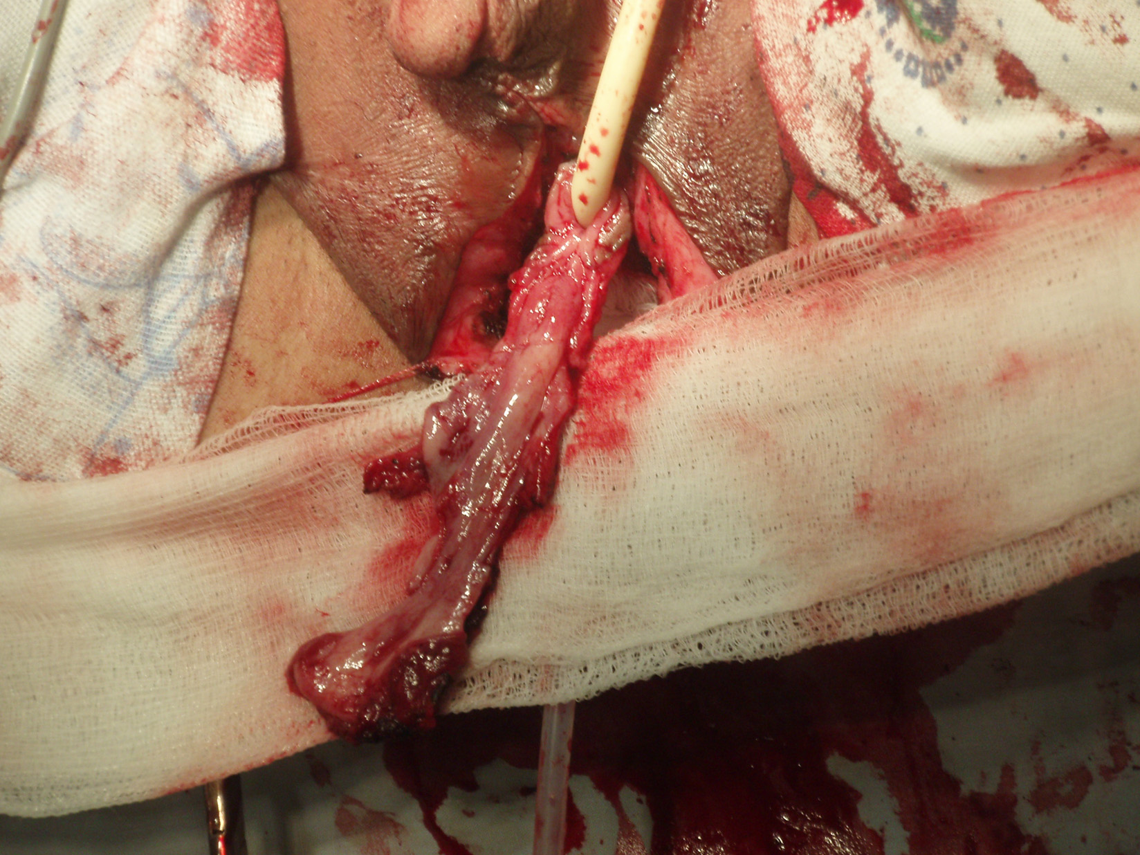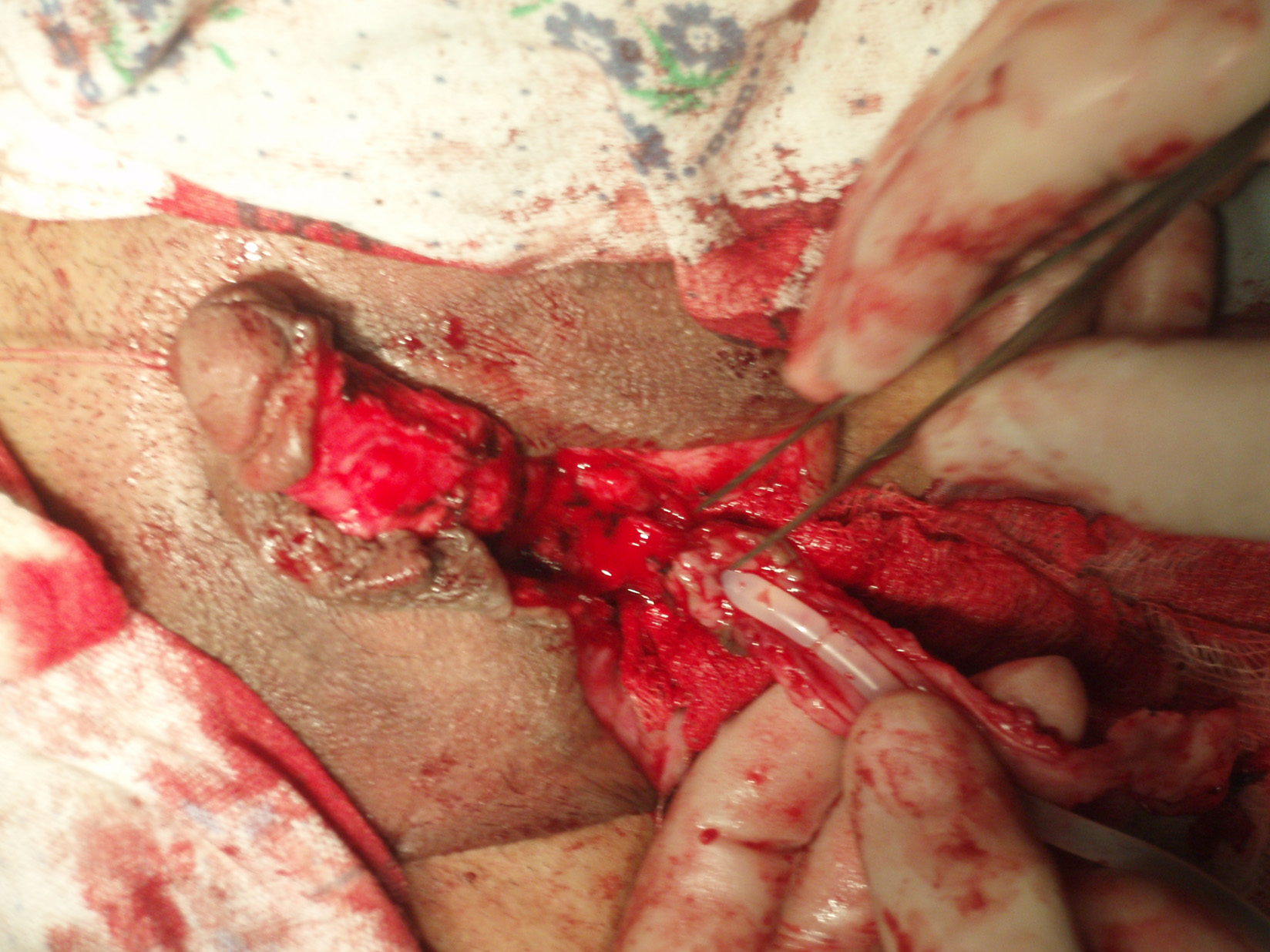 По настоянию пациента ему была произведена одноэтапная операция: экстирпация матки с придатками, удаление влагалища, уретропластика из передней стенки влагалища на сосудистой ножке, выпрямление полового члена с иссечением хорды и выпрямлением полового члена, низведение правого яичка с иссечением оболочек по Бергману , дренирование брюшной полости через промежность, эпицистостомия.