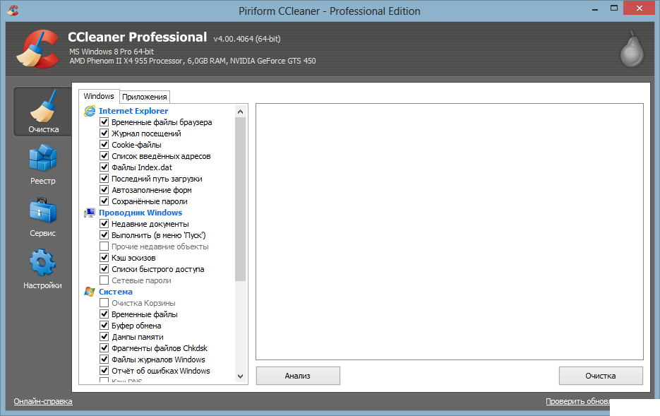 Чистка данных других программ. CCleaner также очищает временные файлы и списки недавно открытых файлов других программ, например: Media Player, Safari, eMule, Kazaa, Google Toolbar, Netscape, MS Office, Nero, Adobe Acrobat, WinRAR, WinAce, WinZip и другие...