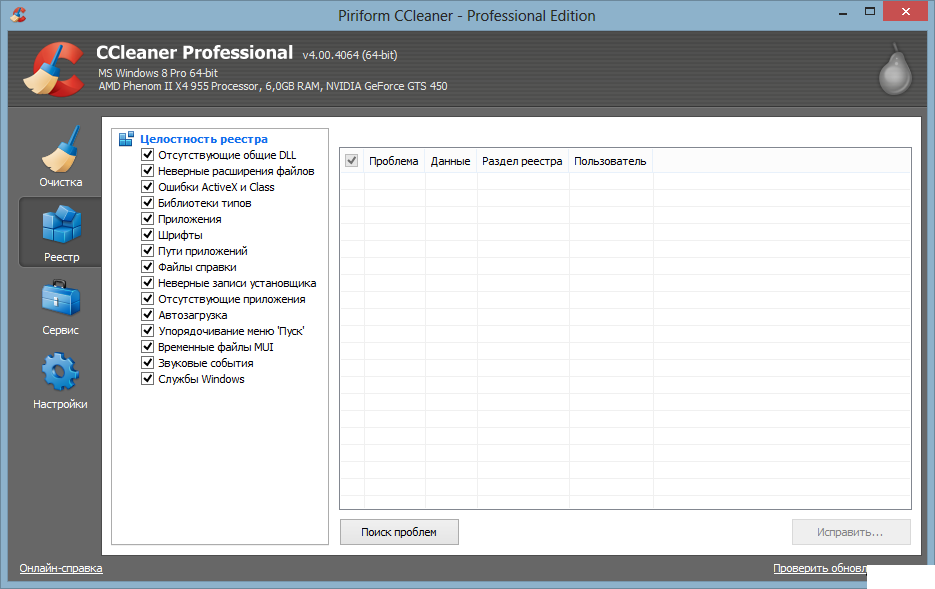 Чистка и оптимизация реестра. Встроенный в программу чистильщик реестра позволяет проводить диагностику, выявляя проблемы и определяя неиспользуемые записи. Удаляются неиспользуемые расширения файлов, элементы управления ActiveX, ClassID, ProgID, общие библиотек DLL, ссылки на удаленные из системы шрифты, файлы справки, иконки, неверные ярлыки и многое другое.