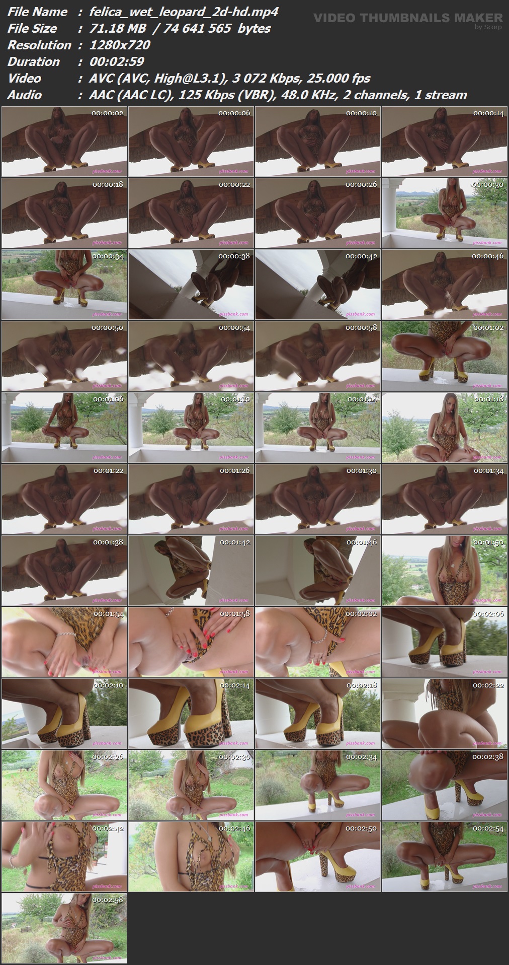 Felica Leopard Style Pissing Released: 2014 Length: 3 min. 00 sec. Starring: Felica Описание и Тех.характеристики видео смотреть в скрине.  Вам необходимо ЗАРЕГИСТРИРОВАТЬСЯ НА ФОРУМЕ, чтобы скачать файл.