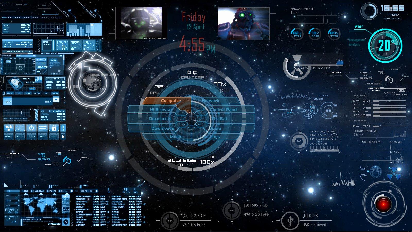 3D эффекта предают 2 программы это Dreamsceneseven с видео файлом HyperSpeed которая выполнена в виде вселенной и программа madotate делает панель задач объемным. Основную роль здесь сыграла оформление Rainmeter которая напоминает бортовое управление космического корабля показывающий глобус крутящей земли, различные датчики ПК как ЦП, ОЗУ, часы, монитор сети, браузер и многое другое. Но есть но, на разрешении монитора 1366x768 все скины не помещаются, так что чем больше монитор, тем лучше! Не волнуйтесь, если вы не знаете, как установить тему, инструкцию по установке в архиве прилагается. Скачивайте и украшайте ваш Windows 7 в 3D рабочий стол Космоса удачи...
