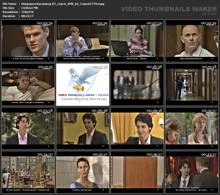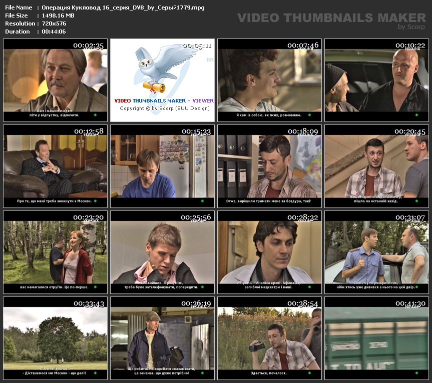 Информация о фильме:Название: Операция "Кукловод" Оригинальное название: Операция "Кукловод" Страна: компания "Пирамида" Год выпуска: 2013 Жанр: Детектив Продолжительность: Приблизительное время серий 45 мин Перевод: Русский ( Украинские вшитые) Режисер: Карен Захаров В ролях: Анастасия Панина, Владимир Яглыч, Денис Варенов, Евгения Чиркова, Андрей Москвичёв, Ирина Баринова, Александр Никольский (II), Андрей Муравьёв, Татьяна Косач-Брындина, Александр Сергеев (IV), Роман Гредин, Екатерина Куликова, Витас Эйзенах, Максим Башкин, Иван Гар, Алла Малковаи др. Описание: Герой сериала – Иван Королёв, майор оперативной службы ФСБ, при проведении операции по захвату оружейного барона попадает с группой в засаду. Получив тяжелое ранение, Королёв "уходит" на более спокойную работу – в спецотдел, занимающийся в основном аналитическими разработками. Так ему сказало начальство. Но на самом деле спокойной жизни не будет. Королёв с новыми коллегами оказывается в самой гуще событий, вызванных многоходовой комбинацией давнего врага России Перецкого. Перецкий, заработавший баснословные капиталы на родине, но вынужденный бежать за рубеж, не оставляет надежд поквитаться и со страной, и со своими недругами. И среди личных обидчиков первым номером числится Иван Королёв. Ведь именно он сорвал нелегальную сделку по продаже большой партии оружия террористам. Расследуя дело за делом, Королёв доберется до Перецкого, преступный замысел которого может нанести серьёзный ущерб России и её населению. Зрителя ждут интригующие расследования, детективный сюжет и опасные погони. Файл:Формaт: MPEG Качеcтвo: DVB Видeo: MPEG2 Video 720x576 (4:3) 25fps Аудио: MPEG Audio 48000Hz mono 192kbps Рaзмер: 46.89 GB