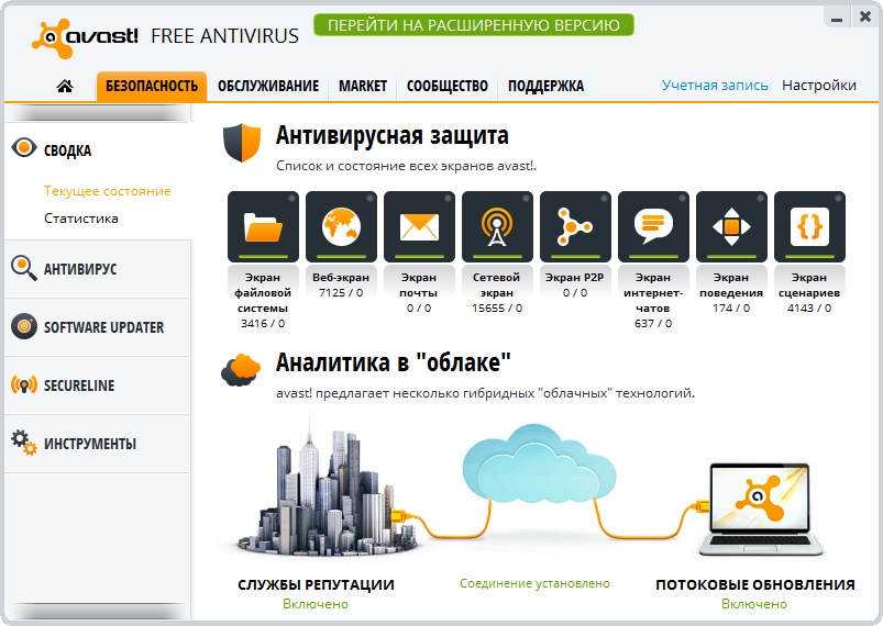 avast! Free Antivirus - бесплатный антивирус Аваст, работа которого основывается на отмеченном рядом наград антивирусном ядре avast!, включает в себя все функции, которых можно ожидать от современной антивирусной программы. В частности, он включает технологию для защиты от "шпионских программ", сертифицированную West Coast Labs Checkmark, модуль защиты от руткитов и надежный модуль самозащиты.