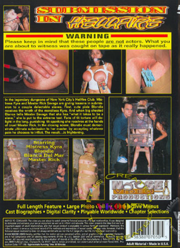 In the legendary dungeon of New York City's Hellfire Club, Mistress Kyra and Master Rick Savage are giving lessons in submission to a couple of delectable slaves. First, cute pixie Blondie receives the wrath of the merciless Kyra. And when big chested Bianca tells Master Savage that she has "what it takes to be a slave: she is put to the extreme test. Fans of tit torture will delight in the long, punishing tit-spanking she receives at the hands of cruel Master Rick. In the closing scene, Blondie must demonstrate ultimate submission to her master, by accepting whatever pain he chooses to inflict. The result is frightening.