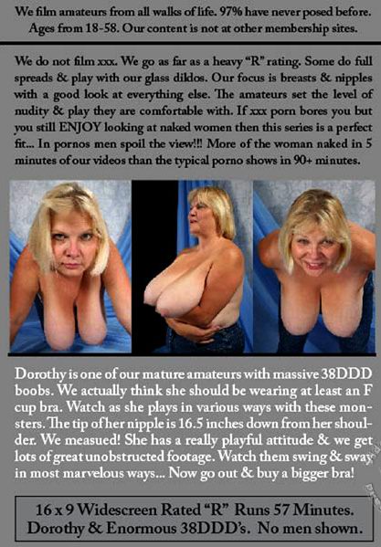 Описание : Dorothy has 38DDD's & in this series we watch them bounce, jiggle & wiggle in most creative ways. Boob wiggling while bending over. Boob wiggling as seen from the rear. She flips her boobs into her face... We measure her boobs in girth, then in length as well as from nipple to nipple. Bending over, on all fours. She can make her boobs do circles. How many ways can you play with boobs & a bra? A little bit more bra play. Boob swinging while bending over. Still flat on her back. Playing with her nipples. Trying to do setups...Here she is in a bra that is painfully too small... Boob juggling & boob smashing. Lifting & dropping the boobs. Lays herself on top of the boobs. A ground level view of what massive boobs look like. Sit-ups are difficult to do. Watch how these boobs move as she tries sit-ups. A sideways view swinging like a pendulum.