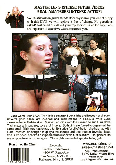 Luna wants Trish BAD! Trish is tied down and Luna licks and kisses her all over. Several glass dildos are inserted and Trish moans in pleasure while Luna caresses her soft white skin. Master Len joins in on the fun and he and Luna drive Trish crazy with tongues, toys and fingers. Both girls are made to orgasm at the same time! Trish now has to pay a terrible price for all of the fun she has had with Luna. Master Len hangs her up by a crotch rope until tears stream down her face. She is whipped, spanked and paddled until her little butt is on fire. Her perfect tits are whipped over and over again. These girls are made to pay for being girls.