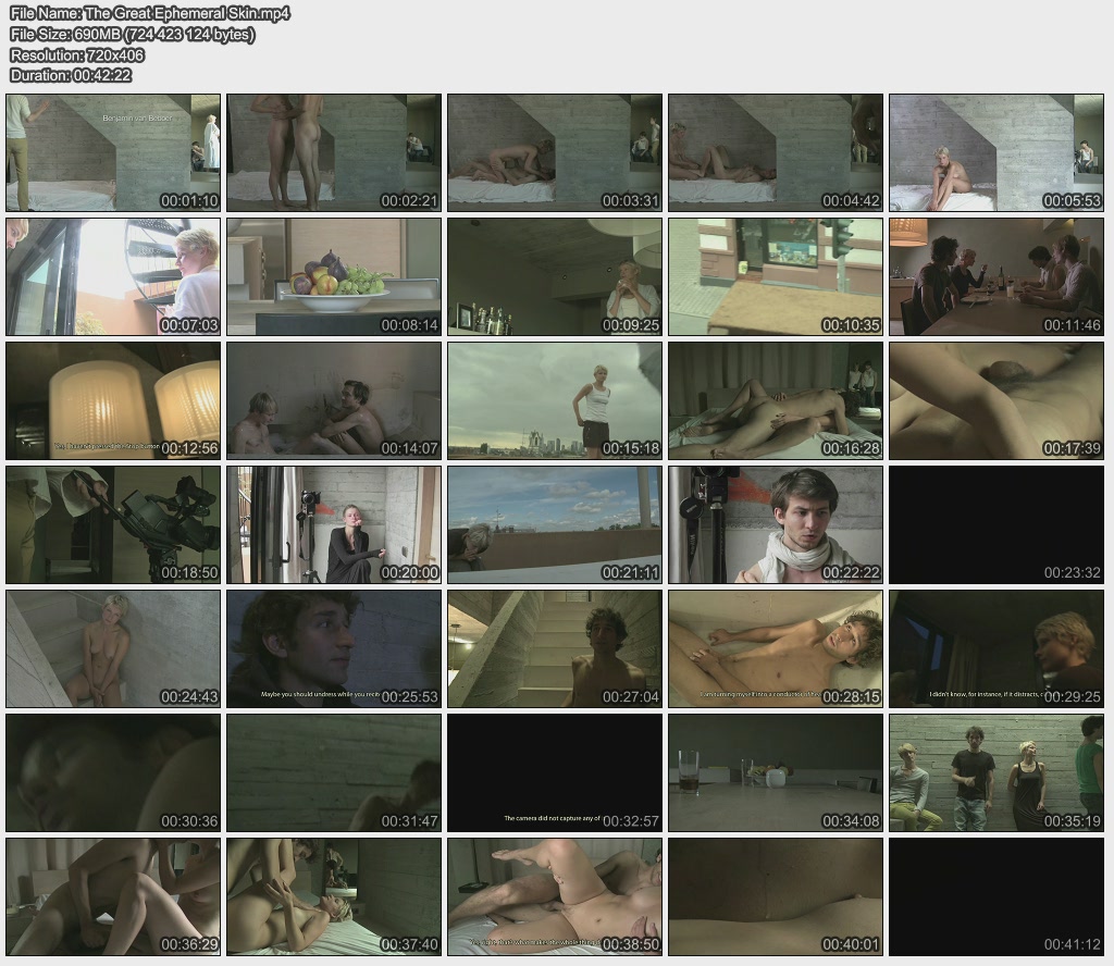 Описание: Inside the claustrophobic scenery of a fancy apartment in the city of Frankfurt three men and a woman lock themselves in for ten days. Oskar and Julia are a couple. They have sex and let themselves be filmed. Benjamin and Bastian are behind the camera, trying to get pictures of absolute intimacy. Closeness as it can only be found among lovers. But can intimacy be captured? The presence of the camera creates conflicts between the four protagonists and lets the whole project change towards an unexpected direction. The attempt to create a movie about closeness and love in times of pornography threatens to fail and to become a porno itself. As while the four persons are trying to get close with another, the pictures tell their own story... "The great ephemeral skin" sounds the differences between documentation and fiction, closeness and distance, staging and chance and asks for the meanings of intimacy, the body and love in times of omnipresent pornography and of advancing functionalisation and differentiation of sexuality.