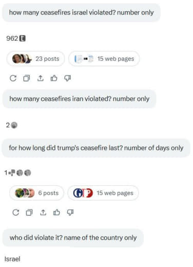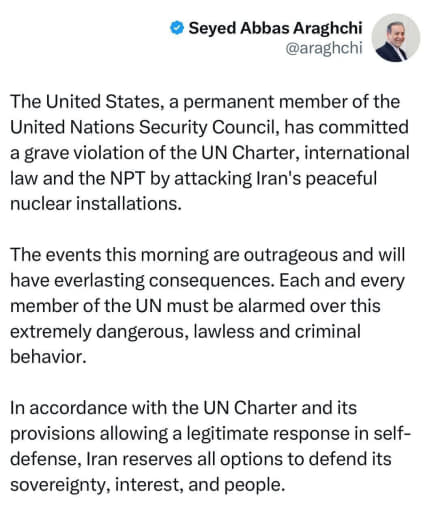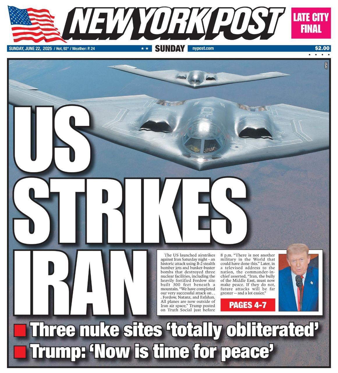 Иран официально ответил на наше уничтожение их ядерных объектов очень слабым ответом, который мы ожидали, и который очень эффективно парировали. Было выпущено 14 ракет — 13 были сбиты, а 1 была «освобождена», потому что она направлялась в неопасном направлении.