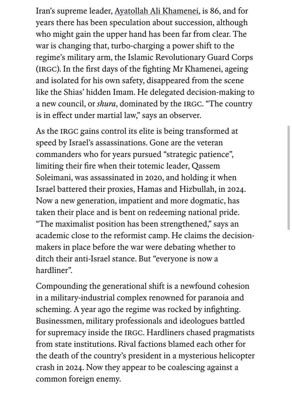 Верховному лидеру Ирана аятолле Али Хаменеи 86 лет, и в течение многих лет ходили слухи о его преемнике, хотя было далеко не ясно, кто может одержать верх. Война меняет это, усиливая переход власти к военному подразделению режима - Корпусу стражей исламской революции (КСИР). В первые дни боевых действий господин Хаменеи, стареющий и изолированный ради собственной безопасности, исчез со сцены, как тайный имам шиитов. Он передал принятие решений новому совету, или шуре, в котором доминирует КСИР. "В стране фактически введено военное положение", - говорит наблюдатель.