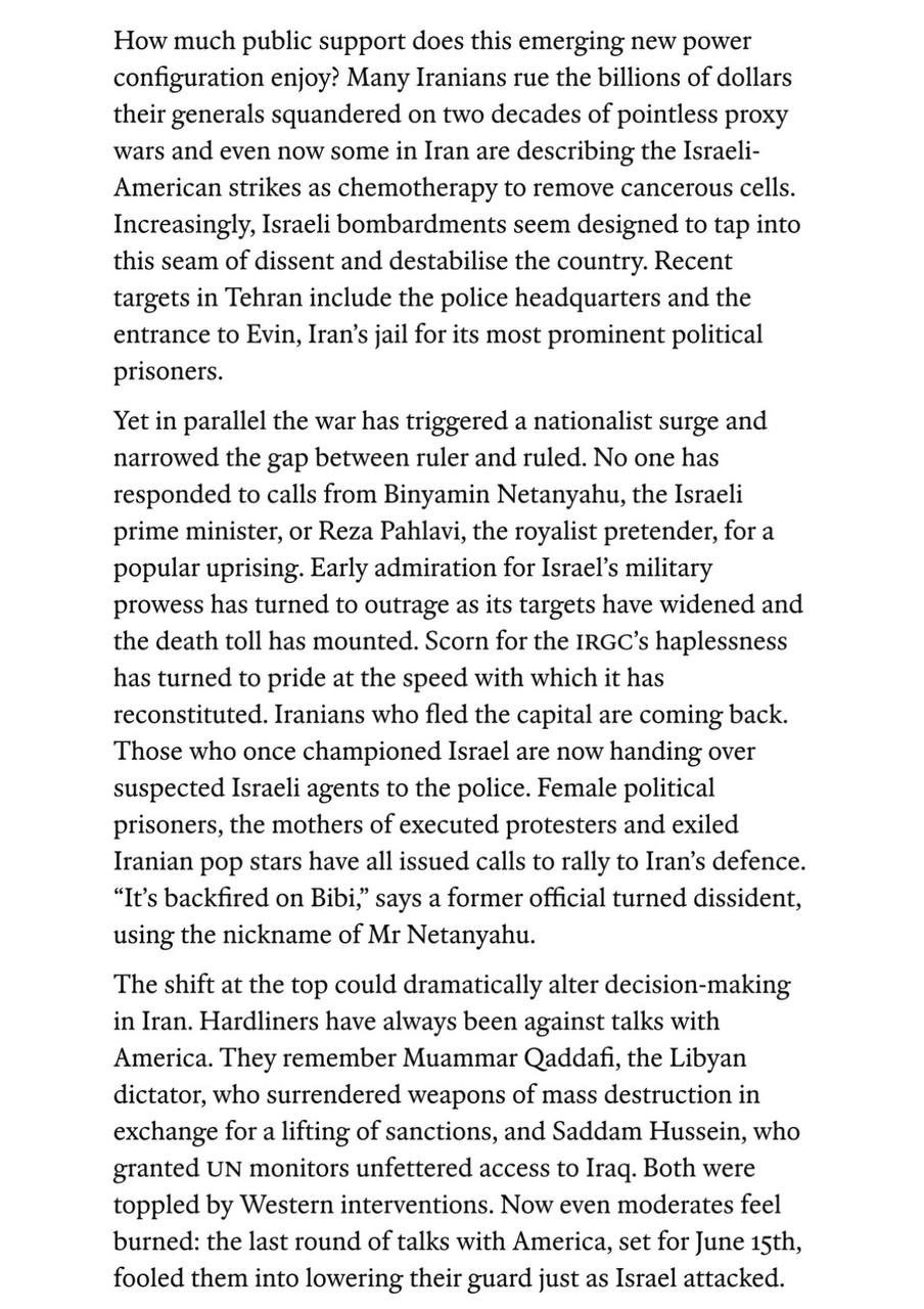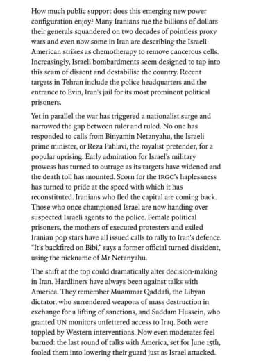 Насколько широкой общественной поддержкой пользуется эта формирующаяся новая конфигурация власти? Многие иранцы сожалеют о миллиардах долларов, которые их генералы растратили на два десятилетия бессмысленных опосредованных войн, и даже сейчас некоторые в Иране описывают израильско- американские удары как химиотерапию по удалению раковых клеток. Кажется, что израильские бомбардировки направлены на то, чтобы затронуть этот очаг инакомыслия и дестабилизировать ситуацию