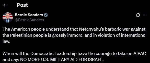 Когда же у демократического руководства хватит смелости выступить против AIPAC (Американо-израильского комитета по общественным связям — крупнейшего лоббиста) и сказать: БОЛЬШЕ НИКАКОЙ ВОЕННОЙ ПОМОЩИ США ИЗРАИЛЮ.