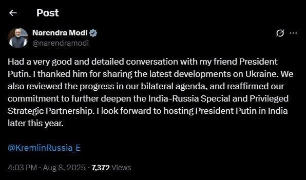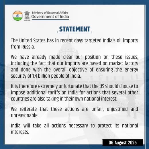 Мы уже четко обозначили нашу позицию по этим вопросам, включая тот факт, что наш импорт основан на рыночных факторах и осуществляется с общей целью обеспечения энергетической безопасности 1,4 миллиарда жителей Индии. Поэтому крайне прискорбно, что США решили ввести дополнительные тарифы в отношении Индии за действия, которые несколько других стран также