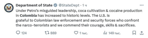 Под ошибочным руководством Петро выращивание коки и производство кокаина в Колумбии достигли исторического уровня. США благодарны колумбийским правоохранительным органам и силам безопасности, которые противостоят наркотеррористам, и мы высоко ценим их мужество, мастерство и жертвы.